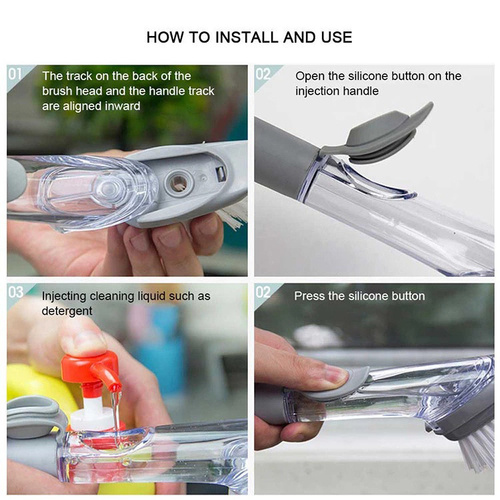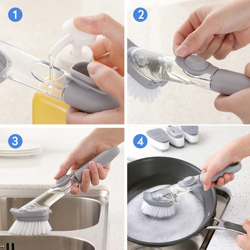پس از آن در هنگام شستشو هربار که نیاز به افزودن مایع شستشو داشتید کافی است دکمه¬ی سیلیکونی را فشار دهید تا مایع شستشو از سوراخ ریزی که در وسط برس و یا اسکاچ تعبیه شده است بر روی محل شستشو بریزد.